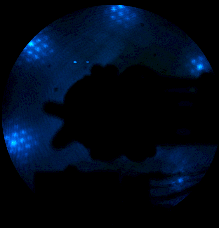 Figure: LEED of a graphene layer on a Ru(0001) surface. The hexagonal arrangement of diffraction spots reflects the symmetry of the surface (some of the diffraction spots are hidden by the sample manipulator). The closely-spaced satellite spots are caused by a superstructure with a lattice constant of approximately 30 Å. It is caused by the lattice mismatch of graphene and Ru(0001), giving rise to a moiré effect. Reprinted with permission from "Scanning tunneling microscopy of graphene on Ru(0001)", S. Marchini, S. Günther and J. Wintterlin, Phys. Rev. B 2007, 76, 075429. Copyright 2007, American Physical Society.